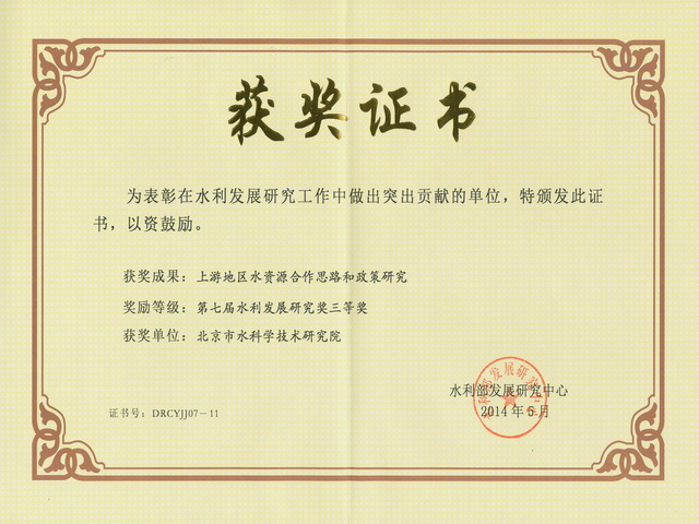 由我院水务发展战略研究所承担的《“十二五”基础设施重大项目规划储备前期工作——上游地区水资源合作和政策研究》项目,荣获第七届水利发展研究奖三等奖。