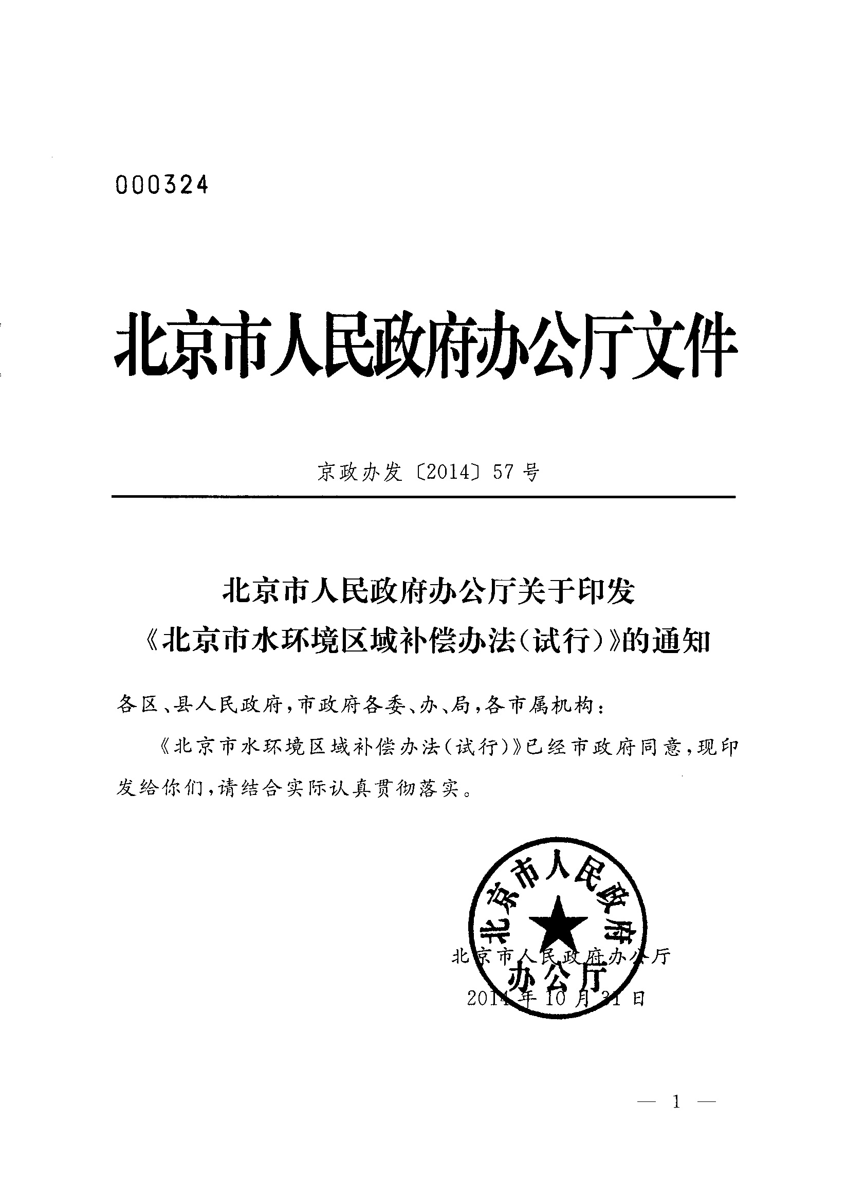北京市人民政府办公厅印发《北京市水环境区域补偿办法(试行)》