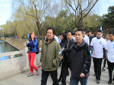 活动伊始,大家聚集在紫竹院公园鲜橙湖北岸,身穿印有“饮水思源”logo的文化衫,佩戴蓝丝带,迈着整齐的步伐,由北京水利学会常务副理事长、市水务局总工陈铁和我院高振宇院长带队,开始了第一项活动“蓝丝带走水行”。“蓝丝带走水行”是我们特意为第23界世界水日、第28届中国水周策划的主题行动,呼应“节约水资源、保障水安全”的主题。蓝色代表纯洁,象征着水务工作者不懈努力保护水环境的毅力和决心,我们一道走上“节水、爱水、护水”的征途,也希望大家都行动起来,践行节水的号召,养成节约用水的生活习惯。