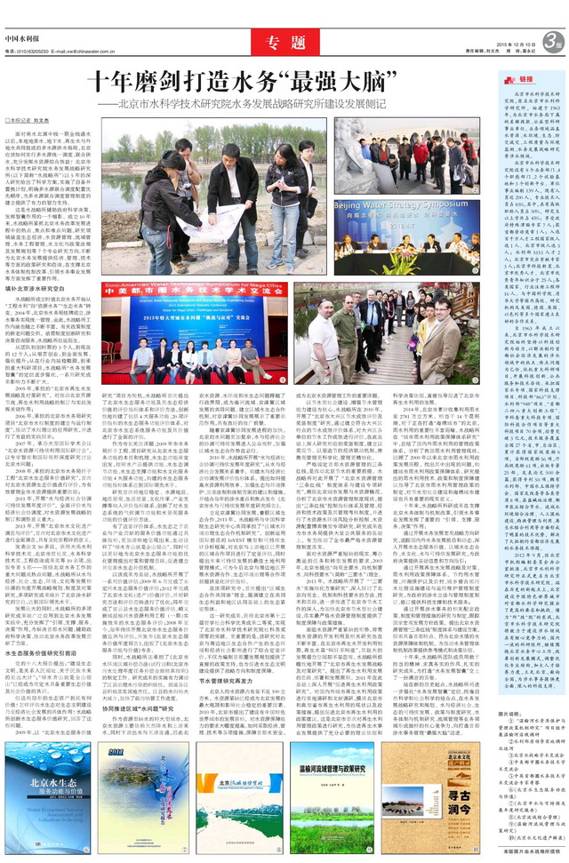 2015年12月10日,中国水利报刊登文章《十年磨剑打造水务“最强大脑”——北京市水科学技术研究院水务发展战略研究所建设发展侧记》。全面介绍了我院水务发展战略所成立10年来的科研成绩,逐步成长为辅助政府科学决策“水务发展智囊”。