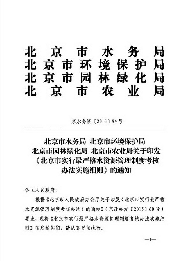 根据《北京市实行最严格水资源管理制度考核办法》(京政办发[2015]60号)的要求,近日,市水务局、市环保局、市园林绿化局、市农业局联合印发了《北京市实行最严格水资源管理制度考核办法实施细则》(京水务资[2016]96),全市将全面开展最严格水资源管理制度考核工作。
