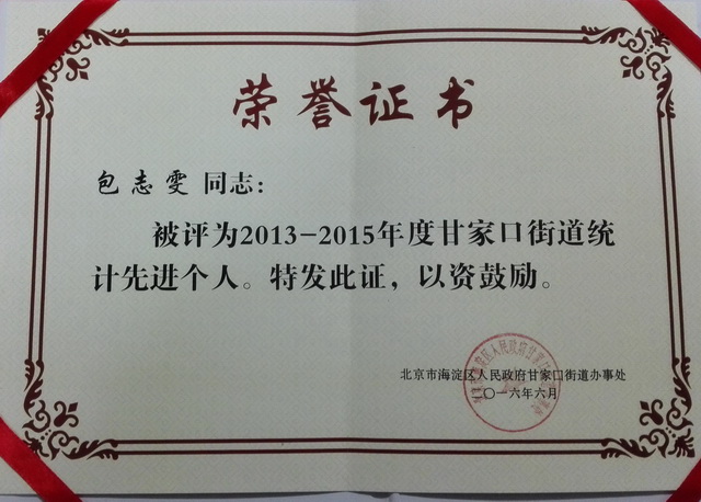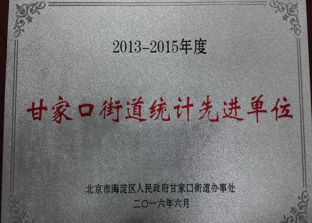 我院在2013-2015年度甘家口街道统计先进单位评选中,被评为统计先进单位,包志雯同志被评为先进个人。