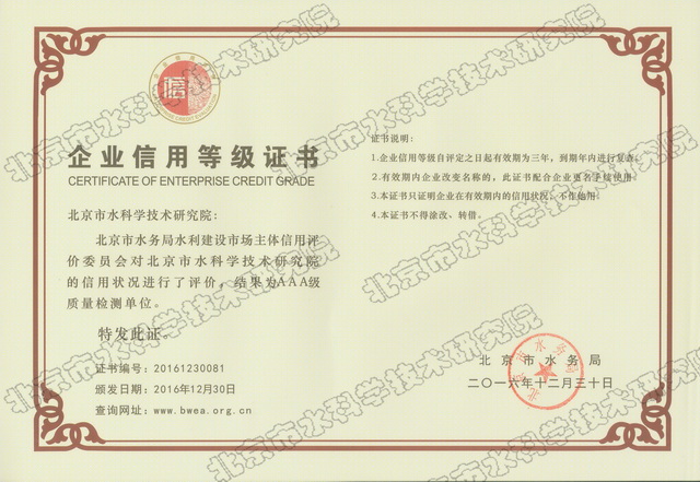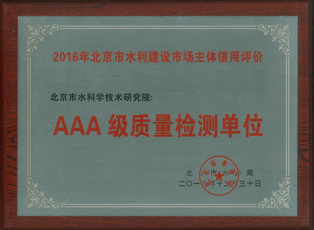 在领导的大力支持下,经全体员工的共同努力,市水科学院获得北京市水务局颁发的水利建设市场主体信用状况AAA级质量检测单位称号。