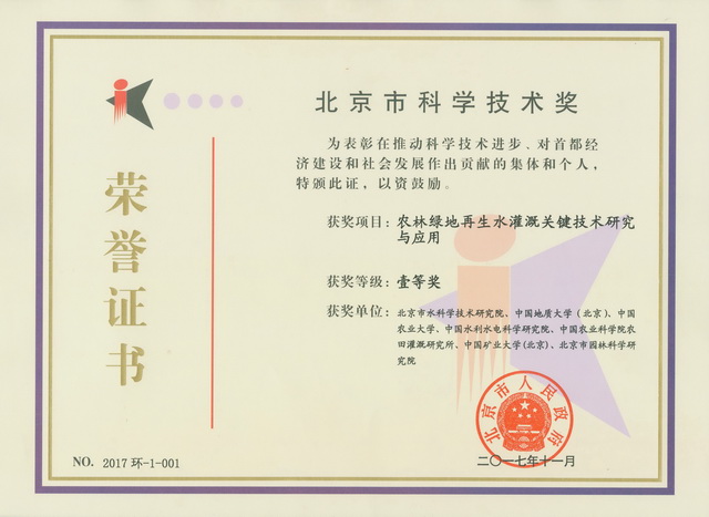 2017年度北京市科学技术奖共评选出获奖项目195项,其中一等奖22项,二等奖51项,三等奖122项。市水科学院作为第一完成单位的4项成果获得2017年度北京市科学技术奖,农林绿地再生水灌溉关键技术研究与应用获北京市科学技术奖壹等奖 。