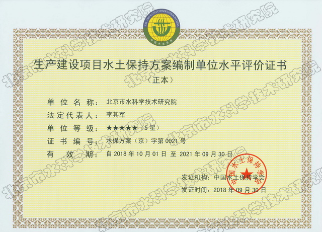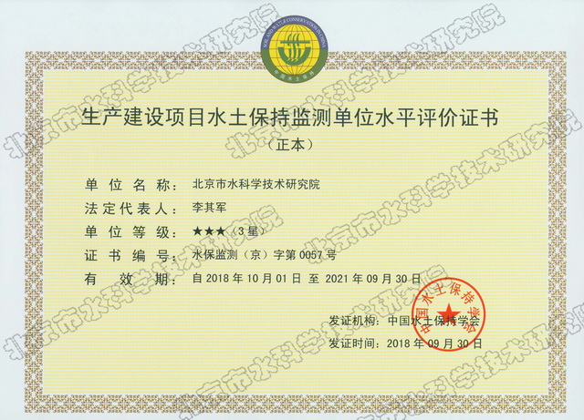 近日,市水科学院获得由中国水土保持学会颁发的生产建设项目水土保持方案编制单位水平评价5星、水土保持监测单位水平评价3星资质证书,有效期自2018年10月1日-2021年9月30日。