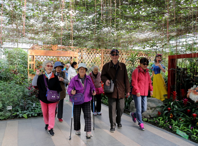 世界花卉大观园由七个温室景观组成,处处花团锦簇、姹紫嫣红。老同志兴致勃勃的从一个温室进入另一个温室,花香无语清气袭人,植物造型盆景令人眼花缭乱,檀木雕刻的古船、战车、水车散发着浓郁的中国文化气息。老同志纷纷拿出手机,拍照留影,流连忘返,陶醉其中。