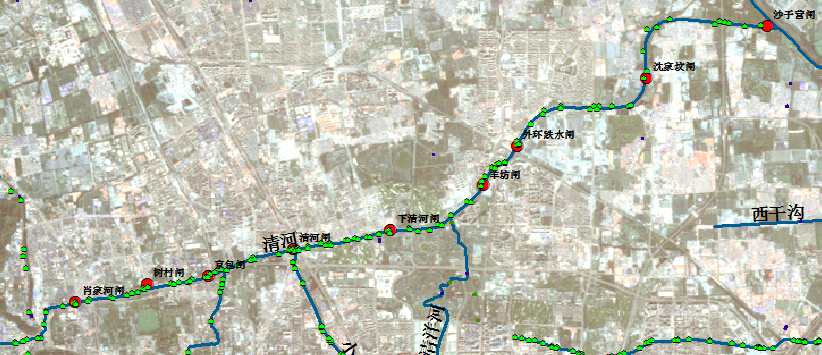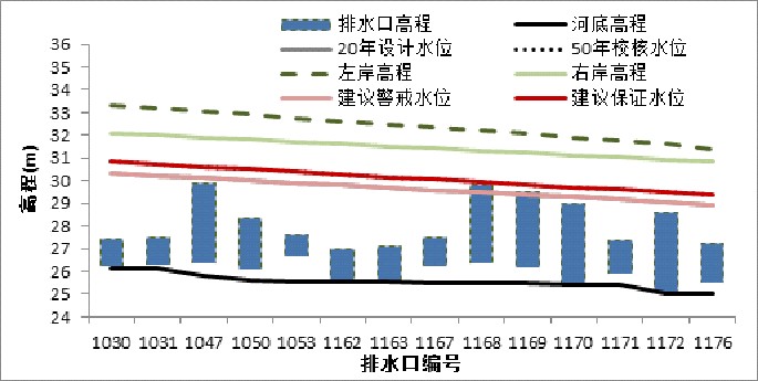图3 排水口高程、河道设计水位、防汛特征水位的关系(清河外环跌水闸至沈家坟闸)