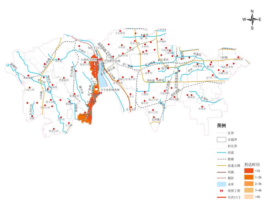 图2 永定河200年叠加小清河100年洪水小清河分洪区洪水到达时间图