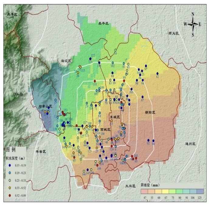 12日上午至13日凌晨,防灾所派2名技术骨干到市水务局驻点支撑,其他技术骨干在院内做好技术保障。为及时响应水旱灾害防御实际业务需求,牢固把握内涝积水预测信息发布的主动权,防灾所技术人员紧急编制了全市内涝积水一张图,数字化下凹桥区、近5年内涝积水点等多源数据资料,统一了内涝积水信息发布口径,为城市内涝系统治理深化奠定坚实基础。午后,降雨开始防灾所两名技术人员赴清河现场调研积水点。