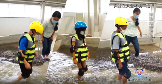 实验以汛期河道浅滩流速为基础,在保证安全的前提下,以生动的事例,让分别让三位学生体验不同水深与流速下的河道浅滩行走难易度,并对汛期天然河道的复杂性、不确定性,对在此情况下学生可能受到的伤害进行讲解。