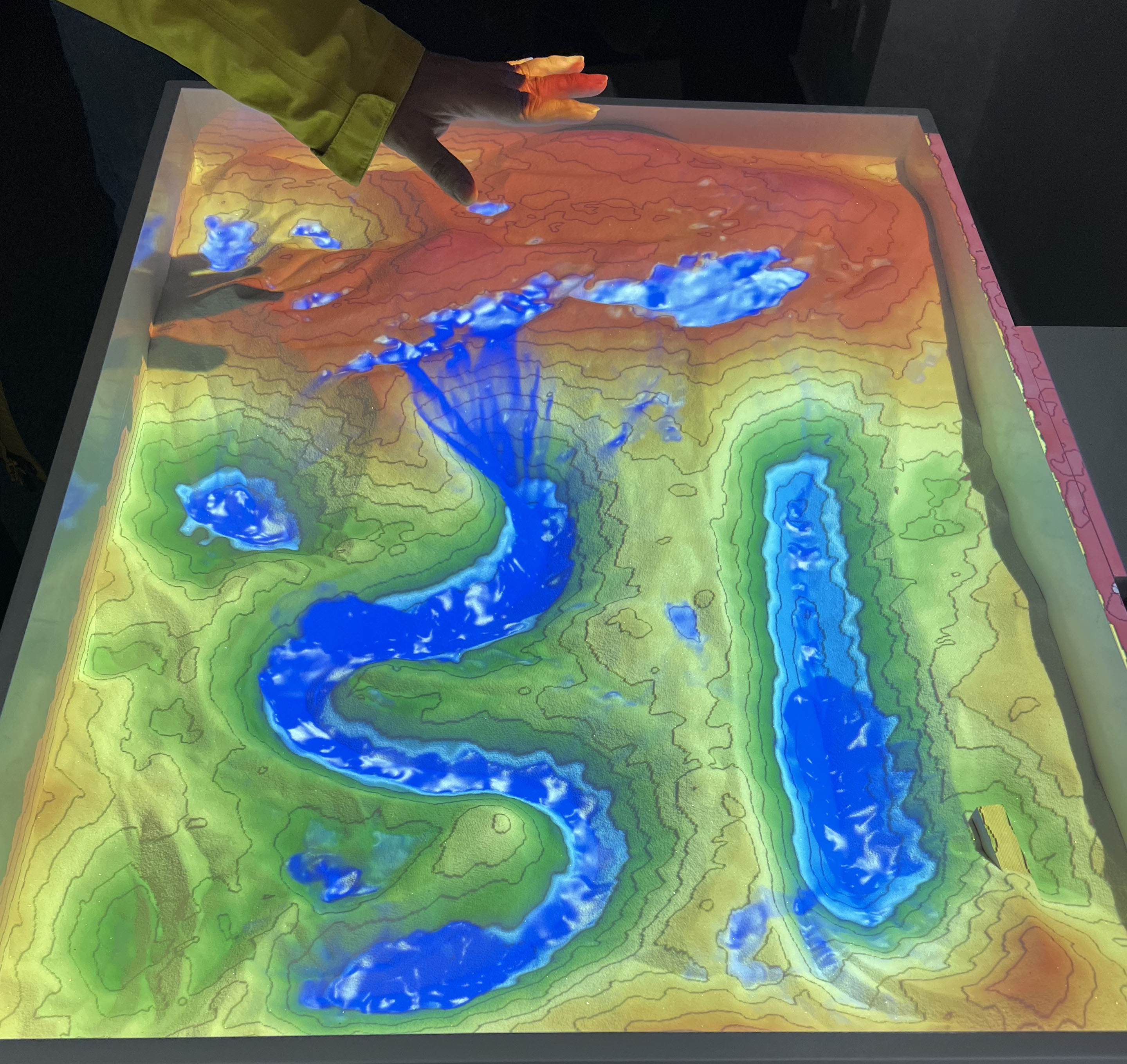 AR流域模拟器可以通过塑造沙子形态创建地形模型,结合后台流体运动方程计算结果,实时将图像叠加到现实环境中,实现人机交互过程中的水流动态模拟与展示。该设备应用场景包括但不限于水务知识科普、辅助规划设计与成果宣传展示。后续将通过部门协同,结合海绵城市、防灾减灾、河道生境构建等方面的已有成果,制定专题展示方案,助力我院科研成果看得见、听得懂、摸得着。