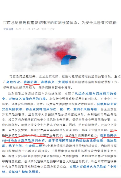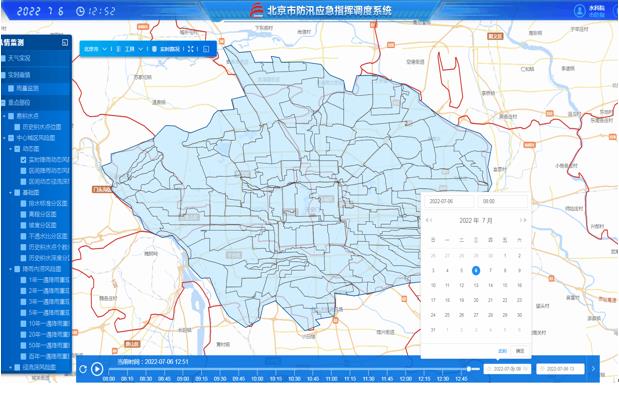 在2022年汛期试运行期间,系统成功应用在“7.5”、“7.27”、“8.4”等多个典型场次降雨应对中,全面支撑市领导掌握、研判城区积水内涝风险变化情况,为抢险单元调度与布控提供科学依据。研究成果获得用户方的一致好评,并作为每年延续性项目,2023年将延伸至昌平、房山区。