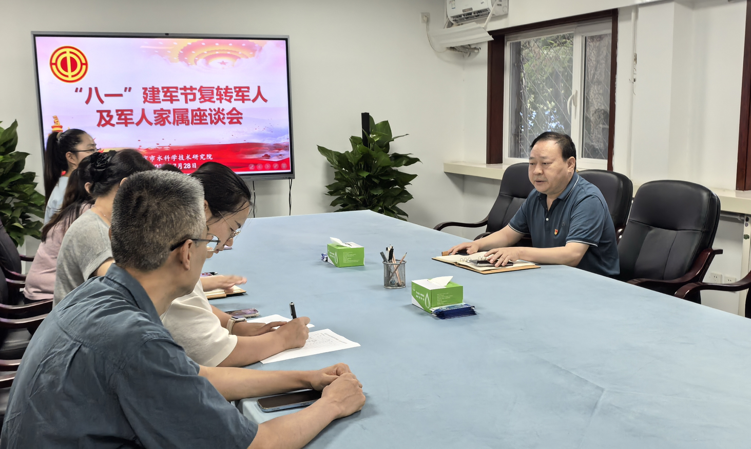 7月28日,在我国第98个建军节来临之际,市水科院组织召开复转军人及军属座谈会。市水科院相关负责人与5名复转军人、军属代表围桌而坐,通过重温军旅记忆、共话发展蓝图的形式,向全体复转军人和军属致以崇高敬意。