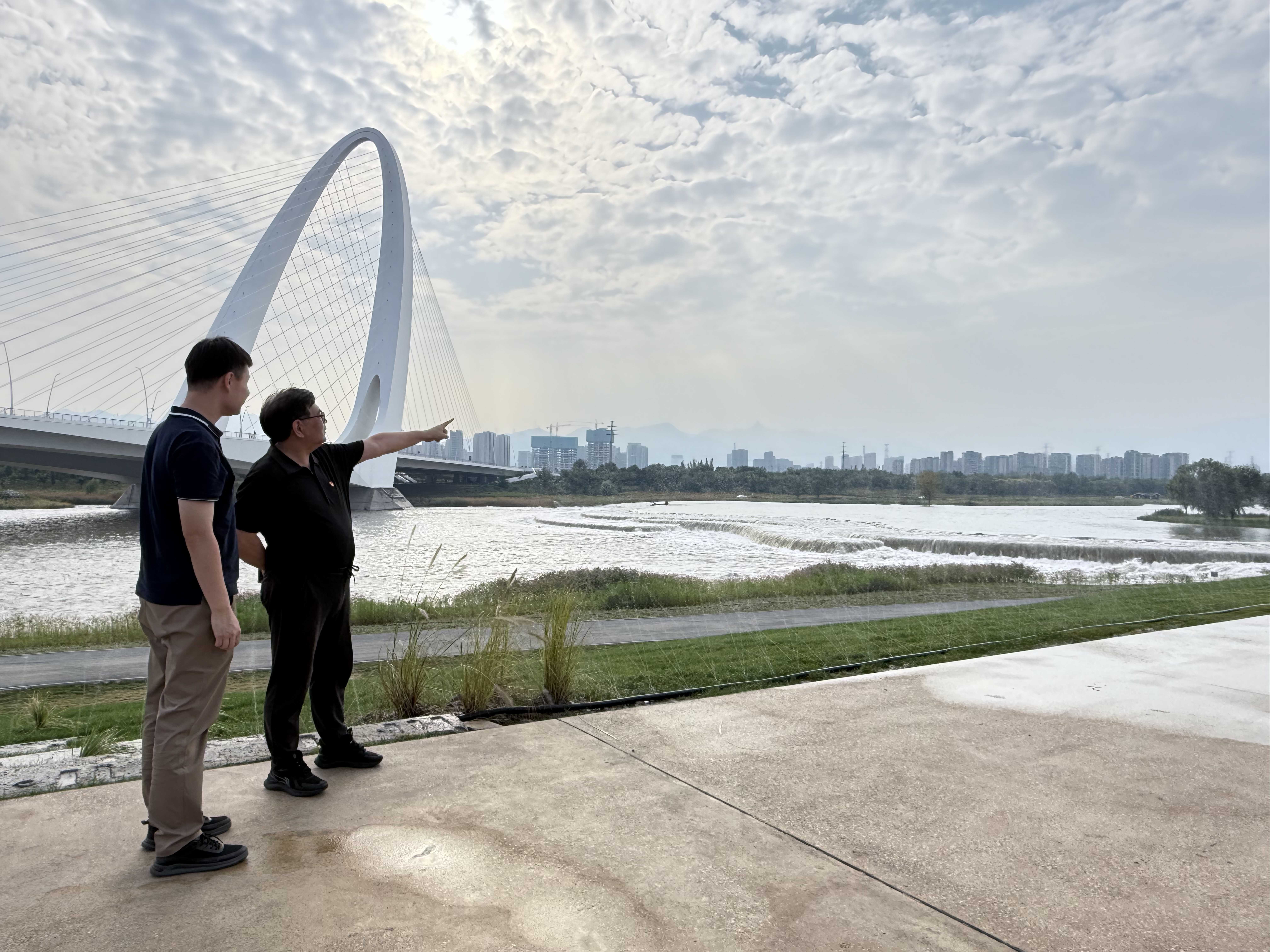 参观完展厅后,部分支部成员结合水务科技创新大会上关于“两园一河”协同联动发展的展示成果,来到紧邻会场西侧的“两园一河”滨水示范区进行实地调研,参观集生态体验、文化展示、休闲娱乐于一体的高品质滨水公共空间,被茵茵水岸、浪涛奔涌的永定河景观所震撼。