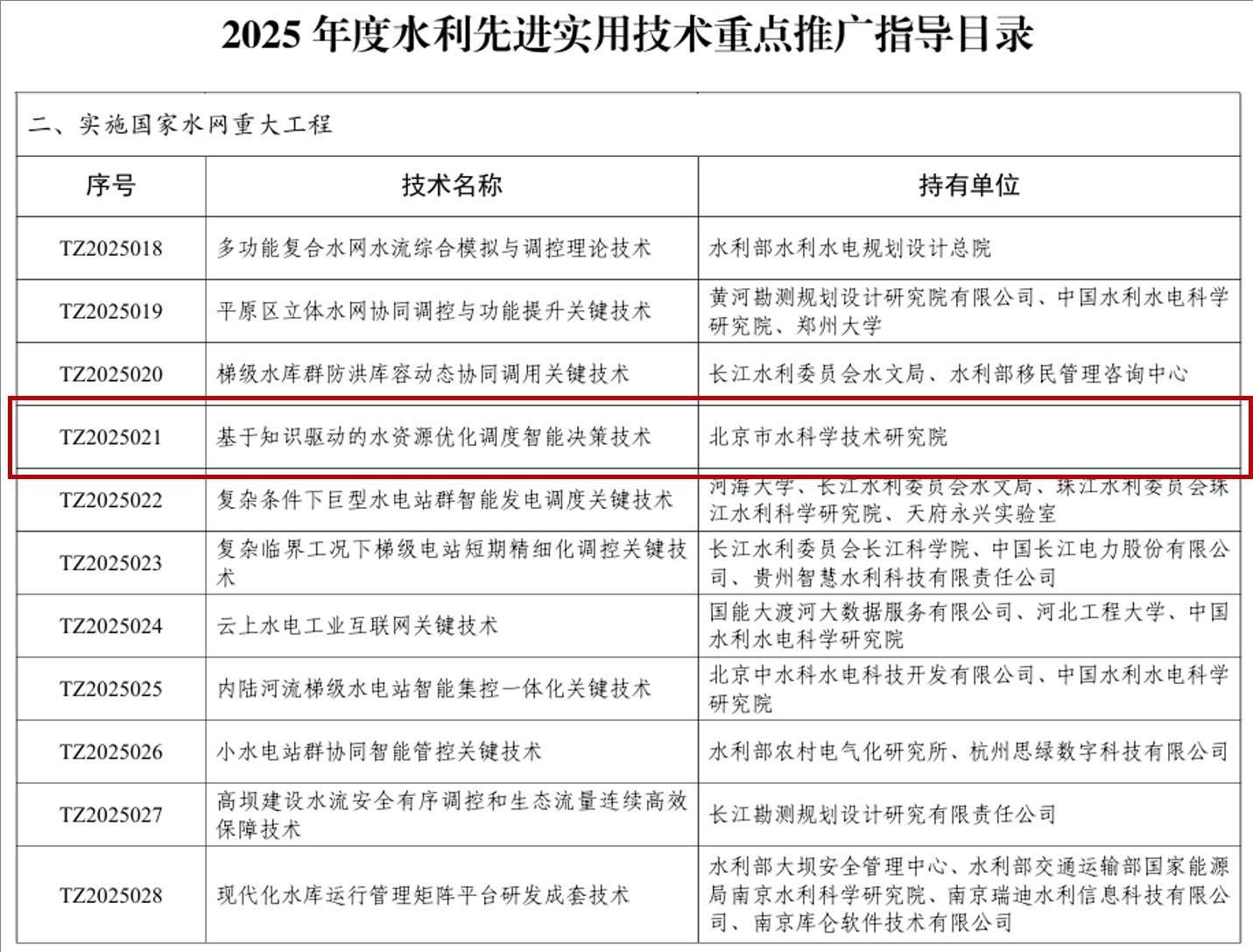 近日,水利部发布《2025年度水利先进实用技术重点推广指导目录》,在水资源处指导下,由北京市水科学技术研究院和北京市水资源调度管理事务中心共同研发构建的“基于知识驱动的水资源优化调度技术”成功入选。该技术在“实施国家水网重大工程”技术推广名录中排名第四,是前13项技术中唯一非水利部直属单位。